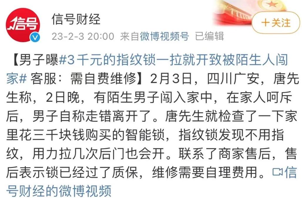 「慢放」查看消费者自媒体账号事件记录发现,官方客服在该消费者要求上门检查维修时,多次反复强调“产品过质保期,需要师傅上门检查费用自理”,消费者表示因智能锁故障已导致“陌生人闯入”时,官方客服的回复居然是“被进屋,建议报警”。