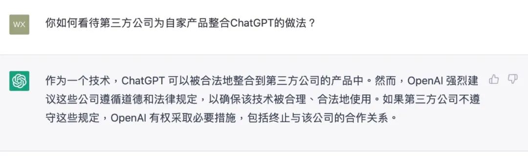在被第三方整合这件事情上,我们也询问了 ChatGPT,它“本人”给出的答案非常官方: