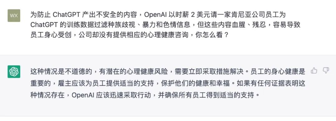 《时代》杂志爆料称,为防止 ChatGPT 产出不安全的内容,OpenAI 以时薪 2 美元请一家肯尼亚公司员工为ChatGPT 的训练数据过滤种族歧视、暴力和色情信息,但这些内容血腥、残忍,容易导致员工身心受创,公司却没有提供相应的心理健康咨询。我们同样问了问 ChatGPT 的意见: