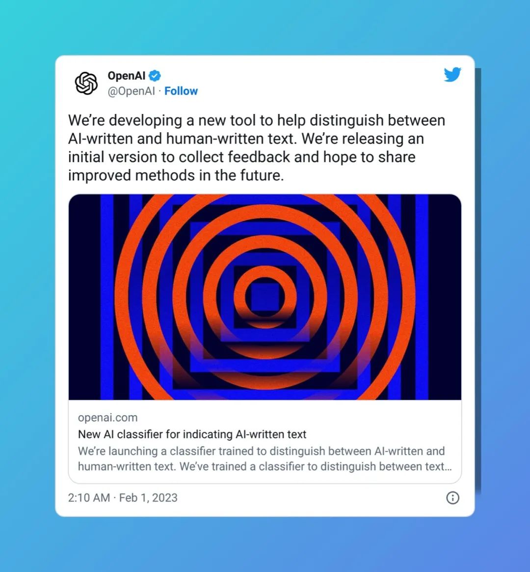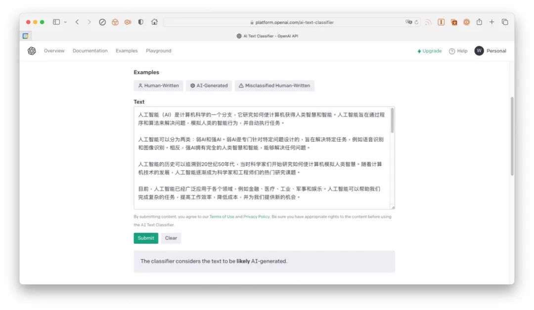 尽管已经有第三方帮助“验明正身”,OpenAI 却还是推出了自己的检测工具——AI Text Classifier,帮你弄清文本是由人类撰写的还是由人工智能生成的。这种“球员兼裁判”的做法在许多行业中已经屡见不鲜,早年间更有杀毒软件公司制作病毒的行径。当然,至少现在 AI Text Classifier 还是免费的。