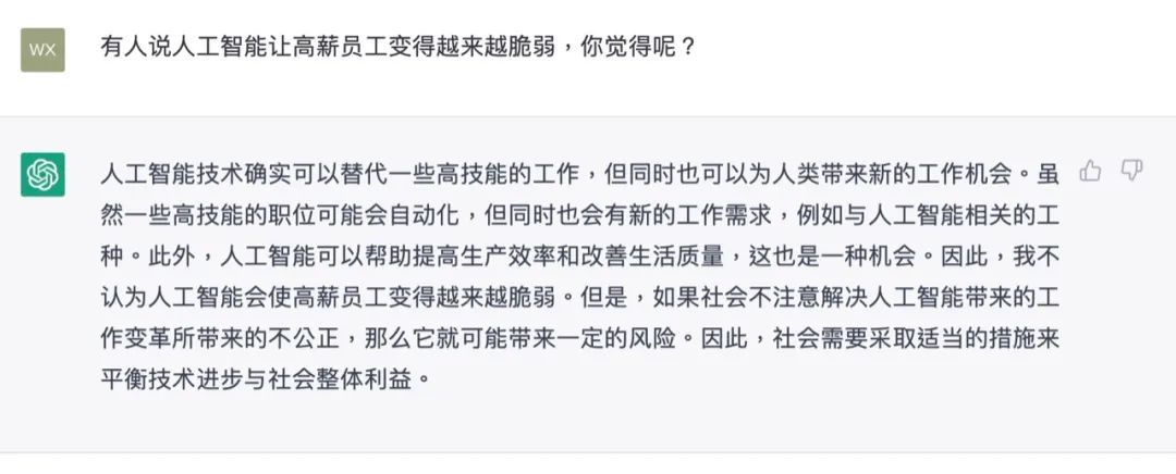 罗切斯特理工学院计算与信息科学系副院长石鹏程(音译)更是发出警告,称人工智能让高薪员工变得越来越“脆弱”。但 ChatGPT 并不认同这种说法: