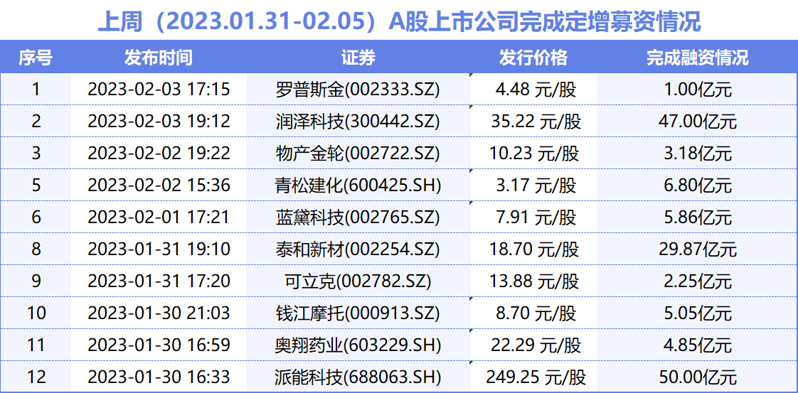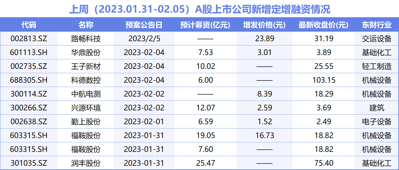 2023年兔年第一周,A股市场上,有9家上市公司发布定增预案,润丰股份(301035.SZ)欲募资25.5亿元,兴源环境(300266.SZ)欲募12亿元,王子新材(002735.SZ)欲募资10亿元。