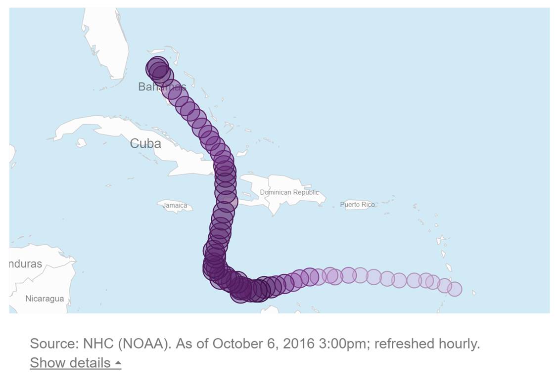 据CNN报道,当地时间10月4日周二上午7点,“马修”在海地西南蒂伯龙半岛登陆,之后袭击巴哈马,现正在步步逼近美国东海岸,预计周四晚上或周五早上袭击佛罗里达州,或造成毁灭性破坏。