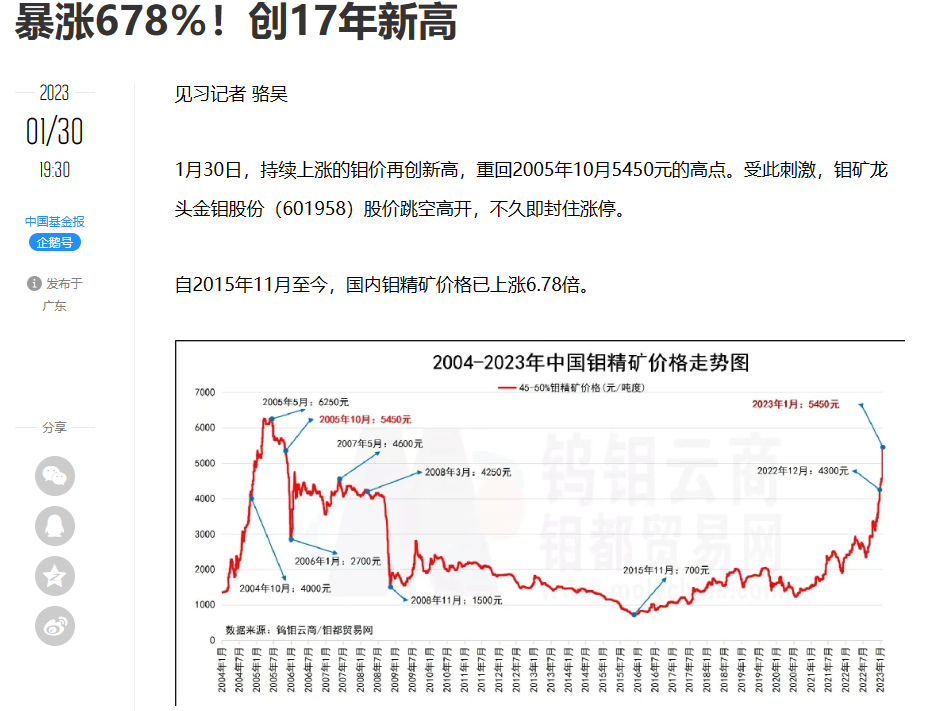 虽然在当前大热的ChatGPT面前,钼价的热度就像太仓一粟,但却不能因此忽视它的存在。毕竟,上市13年股价长期在发行价以下徘徊的金钼股份,2022年破天荒地上涨了70%,并且在2023年进一步加速,市值已逼近500亿元。
