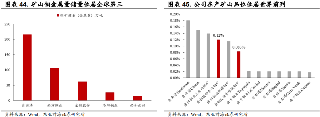 作为国内最大的专业钼生产商,金钼股份运营着金堆城钼矿、东沟钼矿两座大型在产矿山,两大矿山储量总和位居全球第三,平均品位也分列第六和第四。