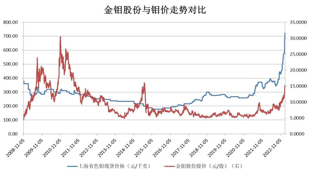 当然,金钼股份股价与钼价走势的关系要更复杂一些,不过在整体趋势上并无太大差异。由下图可知,2019年以来,金钼股份股价与钼价联动更加密切。尤其是2022年以来的上涨,最令人印象深刻。