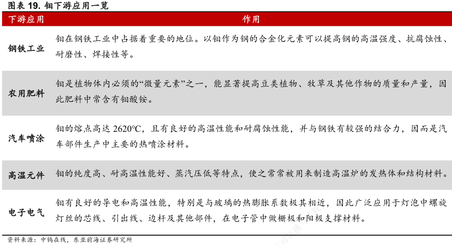 钼作为一种过渡金属,具有高熔点、高硬度、化学性质稳定等特性,广泛用于钢铁、汽车喷涂、高温元件等领域。同时,钼又是植物体内的必需元素之一,因此钼也经常被用于化肥领域。此外,因为良好的导电性和低热膨胀系数,钼还在电子电气领域有广泛应用。