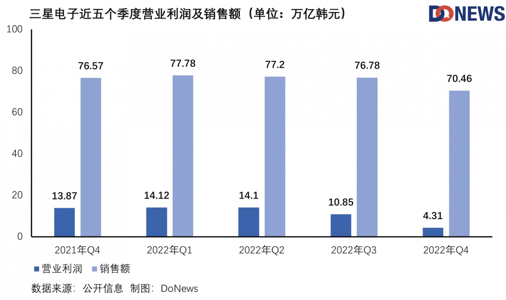 从2022年第三季度开始,三星电子的营业利润出现下滑,第四季度数据更显惨烈。数据显示,三星电子去年第四季度营业利润为4.3061万亿韩元,同比下降68.95%,环比下降60.28%;同样销售额也出现下跌,同比降低8%至70.46万亿韩元。