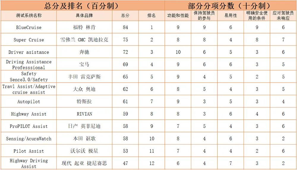 参与测试的系统分别为福特BlueCruise、通用Super Cruise、奔驰Driver asistance、宝马Driving Assistance Professsional、丰田Safety Sence 3.0/Safety System +3.0、大众Travl Assist/Adaptive cruise assist、特斯拉Autopilot、RIVIAN Highway、日产ProPILOT Assist、本田Sensing/AcuraWatch、沃尔沃Pilot Assist、现代Highway Driving Assist系统。
