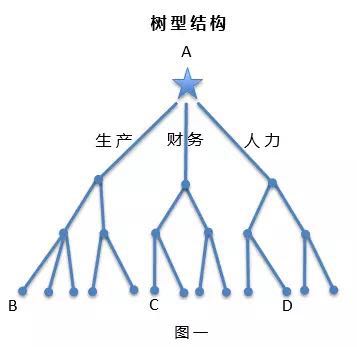 传统的大企业实行分级管理,有它的优势,也存在很多问题。树型结构垂直一条线(图一),生产、财务、人力等职能各自为政,线与线之间、节点与节点之间没有沟通。生产线上的节点B要和财务线上的C对话,必须层层上报,经过总经理A下到C,一路扯皮、推诿,因为生产线和财务线有各自不同的KPI考核指标。B、C、D可称为“信息孤岛”。