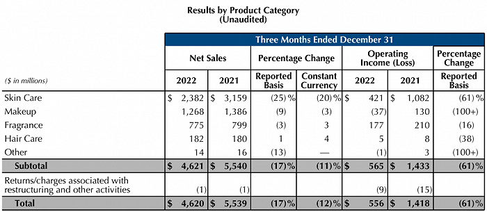 财报显示,雅诗兰黛集团旗下皮肤护理、彩妆、香水、头发护理四大版块中,仅有头发护理同比微增1%。按主要产品类别划分,营收占比52%的护肤产品净销售额为23.82亿美元,下滑最严重达25%,这一部分业务的营业利润大幅缩水61%。