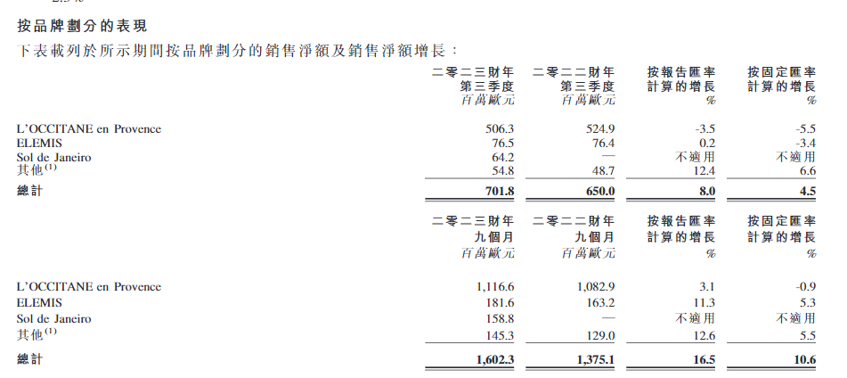 截图L'Occitane欧舒丹集团2023财年第三季度财报