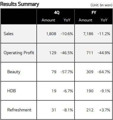2023年1月31日,韩国美妆集团LG生活健康发布2022年第四季度及全年财报。