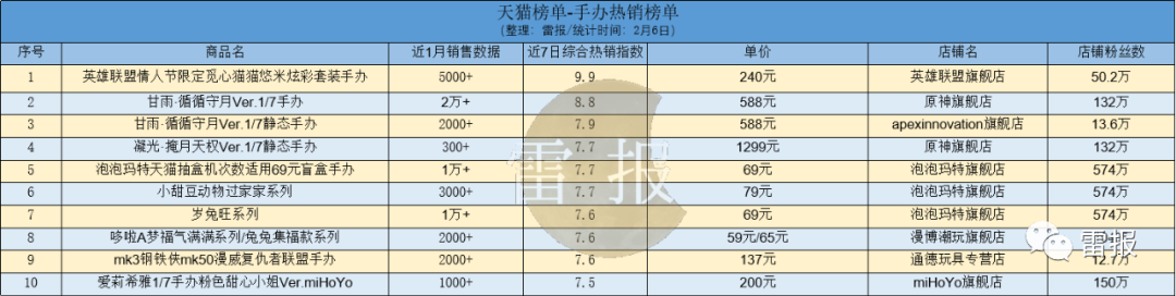 从近期天猫手办的热销榜单来看,受即将到来的情人节的影响,位居榜首的是英雄联盟旗舰店的英雄联盟情人节限定觅心猫猫悠米炫彩套装手办,其近7日的综合热销指数为9.9,其近1月的销售数据为5000+。