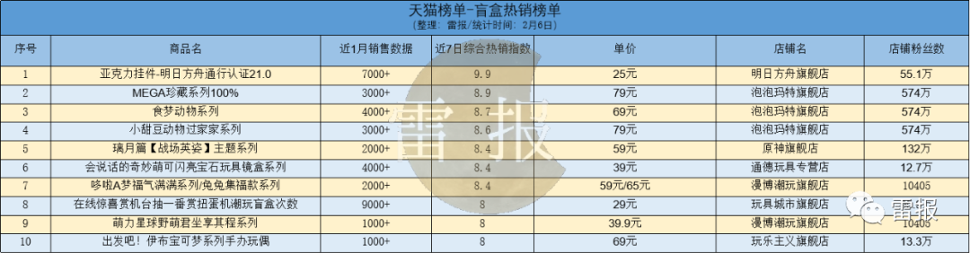 余下第五名至第十名分别为泡泡玛特天猫抽盒机次数适用69元盲盒手办、小甜豆动物过家家系列、岁兔旺系列、哆啦A梦福气满满系列/兔兔集福款系列、mk3钢铁侠mk50漫威复仇者联盟手办和爱莉希雅1/7手办粉色甜心小姐Ver.miHoYo。