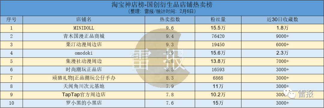 在IP衍生品店铺方面,雷报主要关注IP价值店铺热卖榜、热门漫画衍生店铺热卖榜和国创衍生品店铺热卖榜三个榜单。