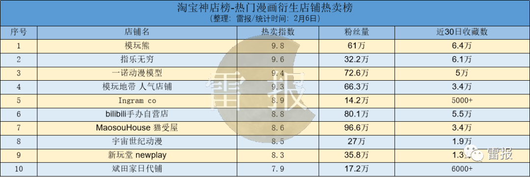 位于榜单第二和第三的为指乐无穷和一诺动漫模型,两家店铺在近30日分别有6.1万和5万的收藏数。两家店铺的热销产品IP包括日漫IP《名侦探柯南》《从零开始的异世界》《灵能百分百》等。