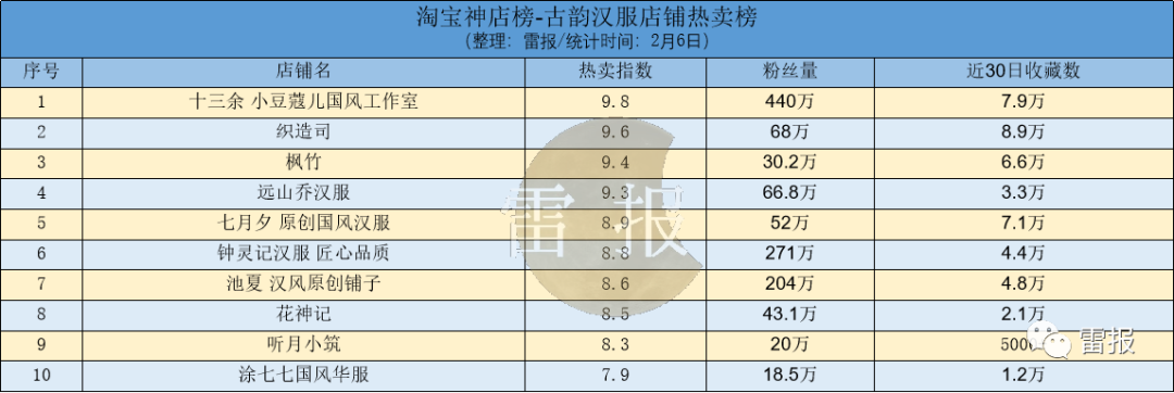 从“三坑”产品来看,位于淘宝神店榜古韵汉服热卖榜的是十三余。该店铺在近30日的收藏数为7.9万,店铺粉丝累计达440万。位于榜单第二和第三的为织造司和枫竹,两家店铺的粉丝量分别为68万和30.2万。