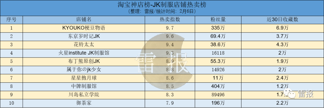 从JK制服店铺热卖榜来看,KYOUKO梗豆物语位于榜首。该店铺在近30日的收藏数为6.9万,粉丝量累计为335万。
