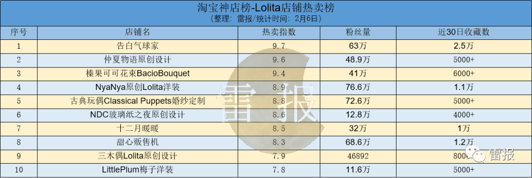 从Lolita店铺热卖榜来看,位于榜首的是告白气球家。该店铺的粉丝量为63万,在近30日的收藏数为2.5万。