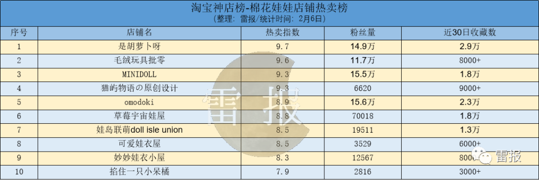 从淘宝神店榜-棉花娃娃店铺热卖榜来看,位于榜首的为是胡萝卜呀。该店铺的粉丝量为14.9万,近30日的收藏数为2.9万。