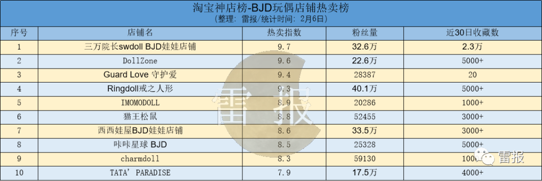 从淘宝神店榜-BJD玩偶店铺热卖榜来看,位于榜首的是三万院长swdoll BJD娃娃店铺。该店铺的粉丝量为32.6万,近30日的收藏数2.3万。