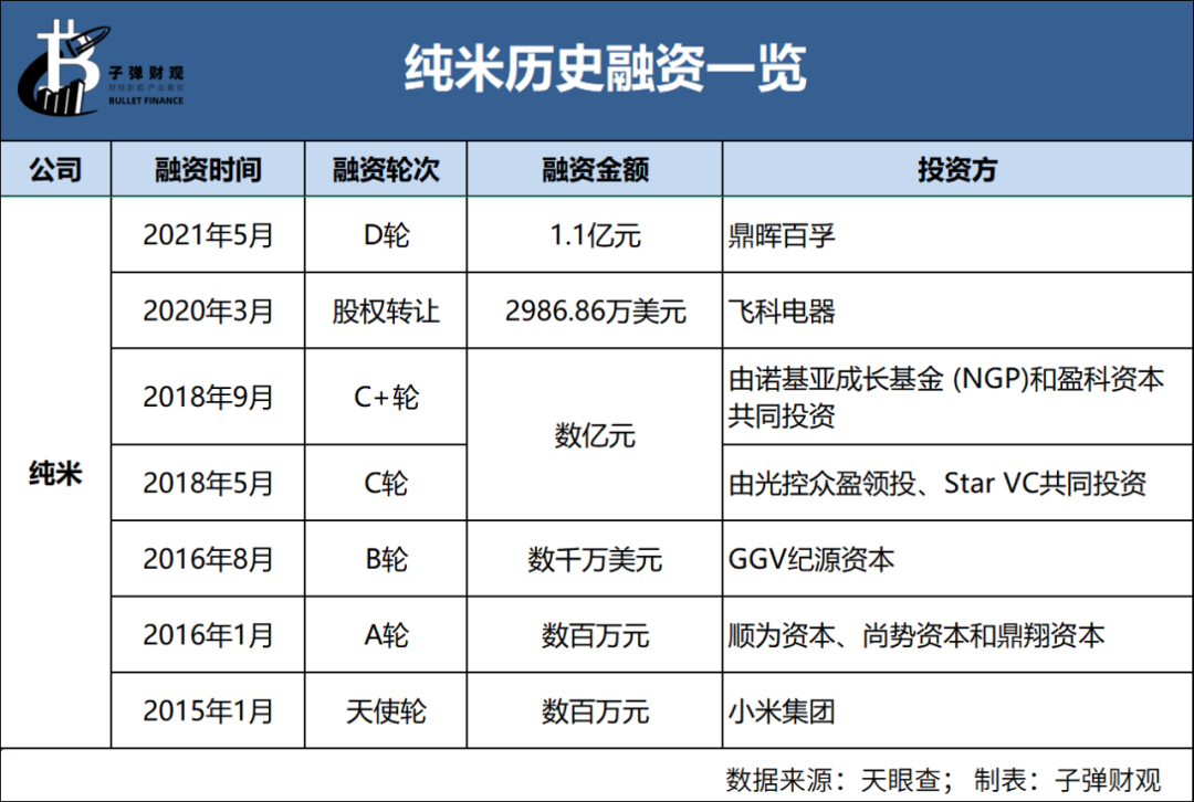 天眼查数据显示,成立至今,纯米共完成7轮融资,几乎是每年融一轮的节奏,投资方里有小米集团、顺为资本、光控众盈、Star VC、飞科电器、GGV纪源资本、盈科资本、诺基亚成长基金、鼎晖百孚等知名机构。