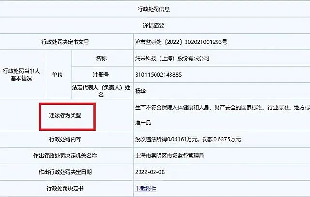 2022年2月,纯米收到了上海市崇明区市场监督管理局的行政处罚单,处罚原因是纯米生产的规格型号为MKX02M220V~50Hz 1300W的智能电烤箱,发热项目不符合标准。此后,纯米还曾申请复检,但二次检测后依旧不合格。