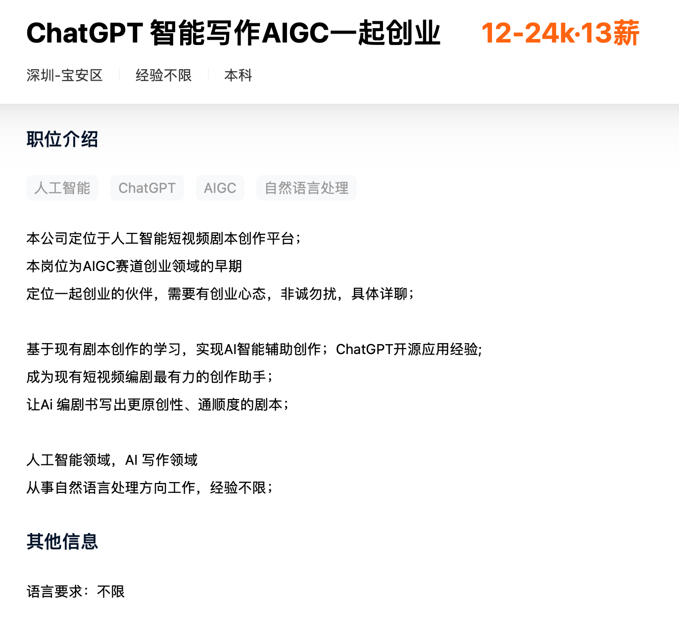 除了科技企业外,也有不少新兴产业前来“蹭热度”。招聘网站显示,深圳某企业正在招聘从事自然语言处理方向工作的创业伙伴,该公司定位为“人工智能短视频剧本创作平台”,并表示将通过AI智能辅助创作,成为现有短视频编剧最有力的创作助手,“让AI编剧写出更有原创性、通顺度的剧本”。