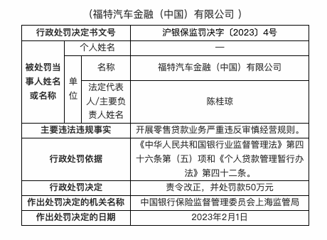 2月8日,上海银保监局行政处罚信息公开表显示,2023年2月1日,福特汽车金融(中国)有限公司因开展零售贷款业务严重违反审慎经营规则,被责令改正,并处罚款50万元。Suda Orankijanan对该公司开展零售贷款业务严重违反审慎经营规则负管理责任,受到警告处罚。