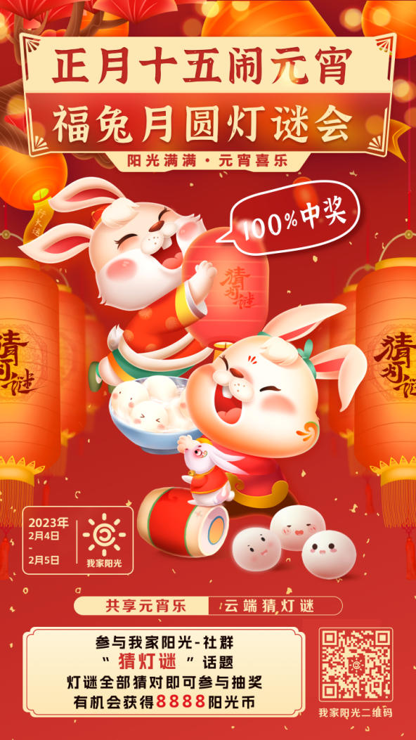 元宵节期间,阳光人寿“我家阳光”APP上线云端“福兔月圆灯谜会”活动。客户通过“我家阳光”APP进入社群查看“猜灯谜”系列话题,庆元宵、揭谜底,全部猜对即可获得抽奖机会,百分百中奖,更有机会获得8888阳光币大奖。