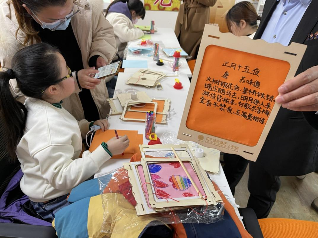阳光人寿杭州本部开展“阳光下午茶——元宵灯笼DIY”客户活动,邀请客户及其子女一同制作灯笼。活动中,主持人介绍元宵节传统风俗,讲解彩灯的制作方式,还将现场人员分成若干小组,要求在规定时间内完成彩灯的制作,并评选出“阳光小能手”,让公司与客户亲子一同度过一个欢乐有趣的传统佳节。