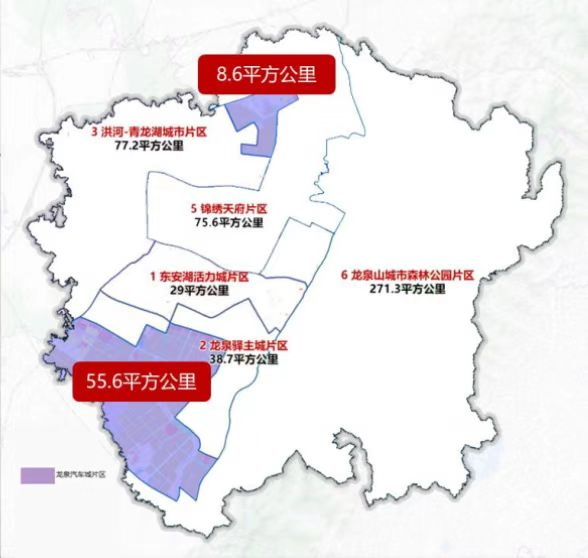 汽车城片区由两大部分组成,其中,第一部分(南区)北至驿都中路、西至龙泉驿区界、东至龙泉山城市森林公园。第二部分(北区)北至沪蓉高速、南至锦洛西路、西接洪河-青龙湖城市片区、东接锦绣天府片区。