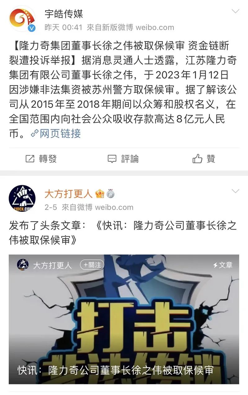 近日,多家媒体披露,江苏隆力奇集团有限公司董事长徐之伟,于2023年1月12日因涉嫌非法集资被苏州警方取保候审。