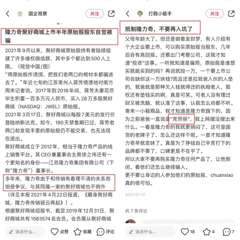 2021年3月17日,聚好商城(JWEL.US)于纳斯达克上市,是一家主营日化商品和保健品销售的会员制电子商务平台。早在2021年7月,就有消费者在小红书发布自己家人被聚好商城的原始股蒙骗的消息,甚至有消费者被骗上百万元。