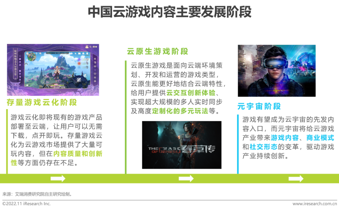 游戏内容与游戏体验是云游戏时代的竞争核心,从发展阶段看,云游戏的内容发展可以分为存量游戏云化、云原生游戏和元宇宙游戏三个阶段。目前国内云游戏市场仍处于将现有的存量游戏产品云化,以供用户游玩的阶段。而面向云端环境开发和运行的云原生游戏已在探索之中,通过云原生的方式,可以将云端超大规模算力提供给游戏运行,带来全新的游戏模式和玩法,并最终开发出元宇宙游戏。