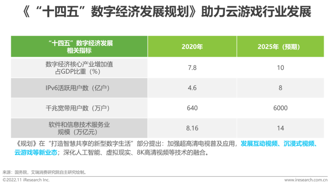 根据中国信息通信院发布《中国数字经济发展报告(2022年)》显示,2021年我国数字经济规模达到45.5万亿元,同比增长16.2%,数字经济占GDP比重达到39.8%,已成为驱动我国经济高质量发展的关键动力。2021年12月,国务院印发《“十四五”数字经济发展规划》,对数字经济发展提出新的发展原则和发展目标,并在“打造智慧共享的新型数字生活”部分提出要发展云游戏新业态,而千兆宽带用户数、软件和信息技术服务业等规模预期,对于云游戏产业的发展和普及同样有着重要的推动作用。