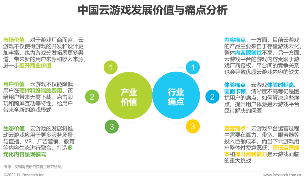 中国云游戏产业价值与行业痛点分析云游戏给行业带来新的增量,但发展过程中仍存在较多痛点元宇宙的火热使得云游戏迅速进入主流游戏市场,并给游戏行业带来新的想象空间:云游戏有望给行业带来新的市场增量和用户增量,通过无需下载、点击即玩、跨屏互动等特性,提升用户体验和用户粘性。但在近三年的发展过程中,行业仍存在着挑战和痛点,在游戏内容、用户体验和商业模式等方面仍需要市场进一步探索及验证。