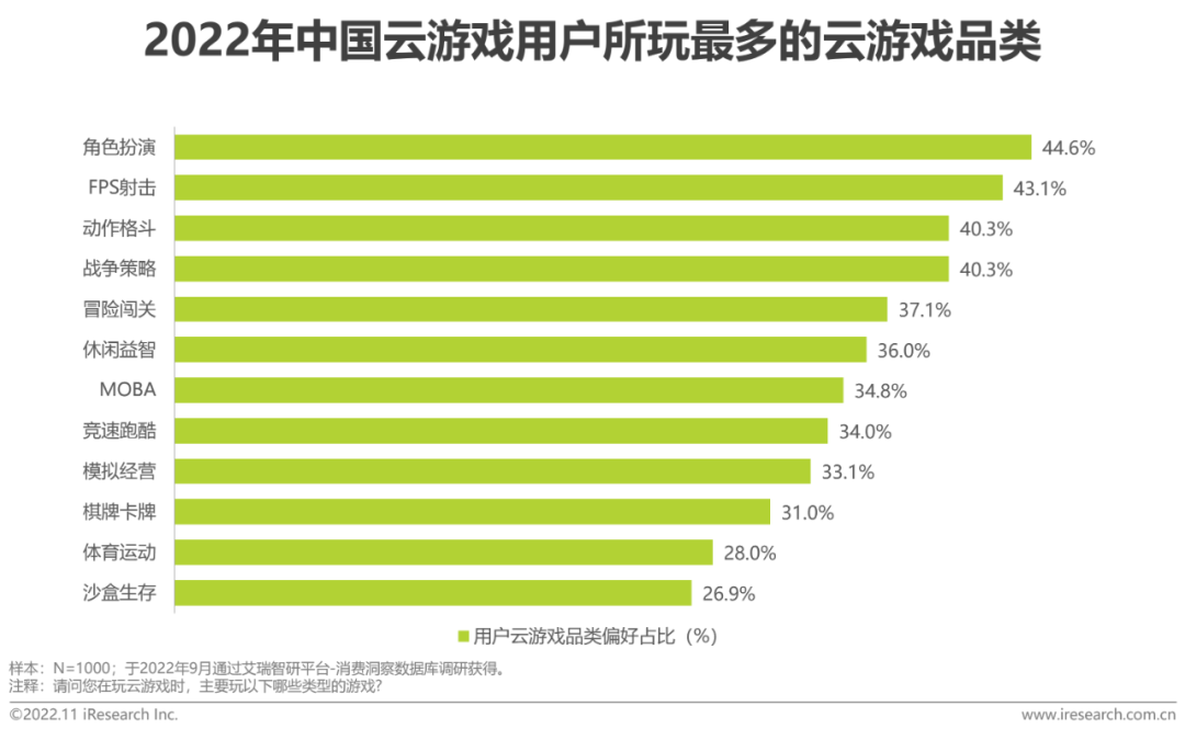 从云游戏用户偏好内容看,移动游戏仍是用户玩云游戏时最受欢迎的产品;而从游戏品类看,角色扮演类、FPS射击类和动作格斗类是用户最喜爱的游戏品类;无需下载和安装,点击即玩的便捷属性,是云游戏吸引用户的最主要原因。