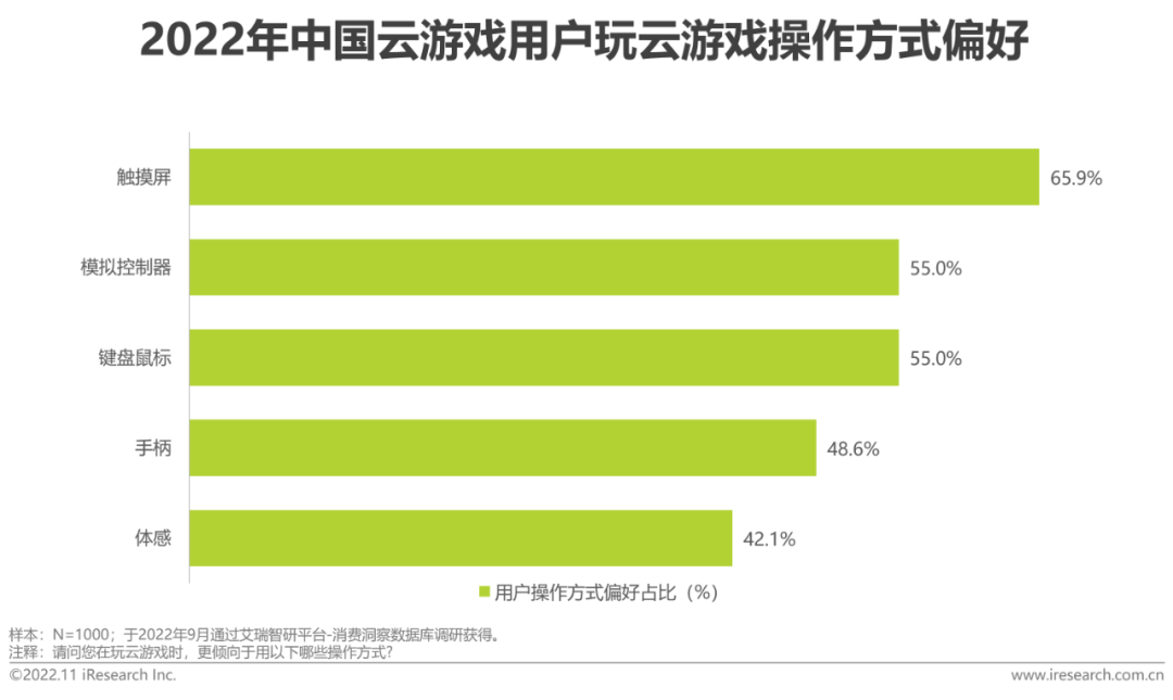 基于智能手机在国内的广泛普及,手机以超过8成的渗透率成为用户玩云游戏的最主要使用设备;同时,移动游戏流行带来的触摸屏操作,也对国内游戏用户的操作习惯带来的很深的影响,超过65%的用户在玩云游戏时同样偏好触摸屏操作。
