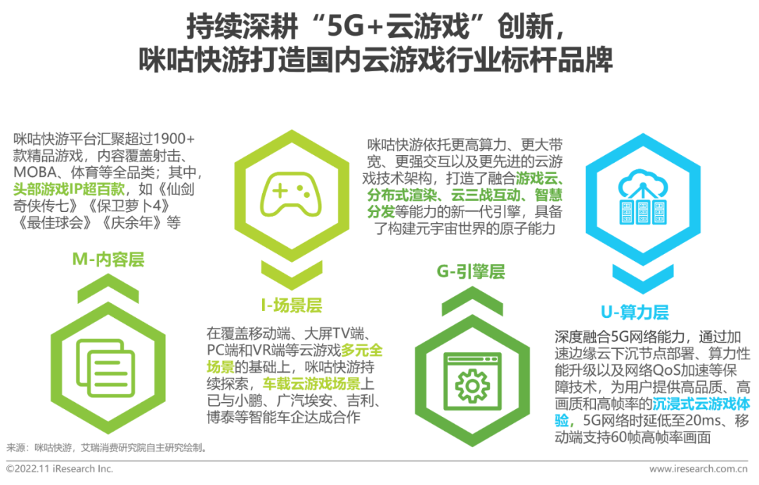 依托中国移动的5G技术优势和内容优势,咪咕互娱全面探索“5G+X”应用场景创新,打造了国内首个电信级云游戏平台——咪咕快游。目前,咪咕快游已率先在行业内构建起跨“移动端、TV端、PC端和VR端”的全产品矩阵,实现云游戏体验场景的全覆盖。截至2022年9月,咪咕快游全场景月活用户数已达1.2亿,平台拥有1900+款在线畅玩精品云游戏,已成为目前国内云游戏业务领域用户规模领先、内容数量领先、技术创新领先的云游戏平台。