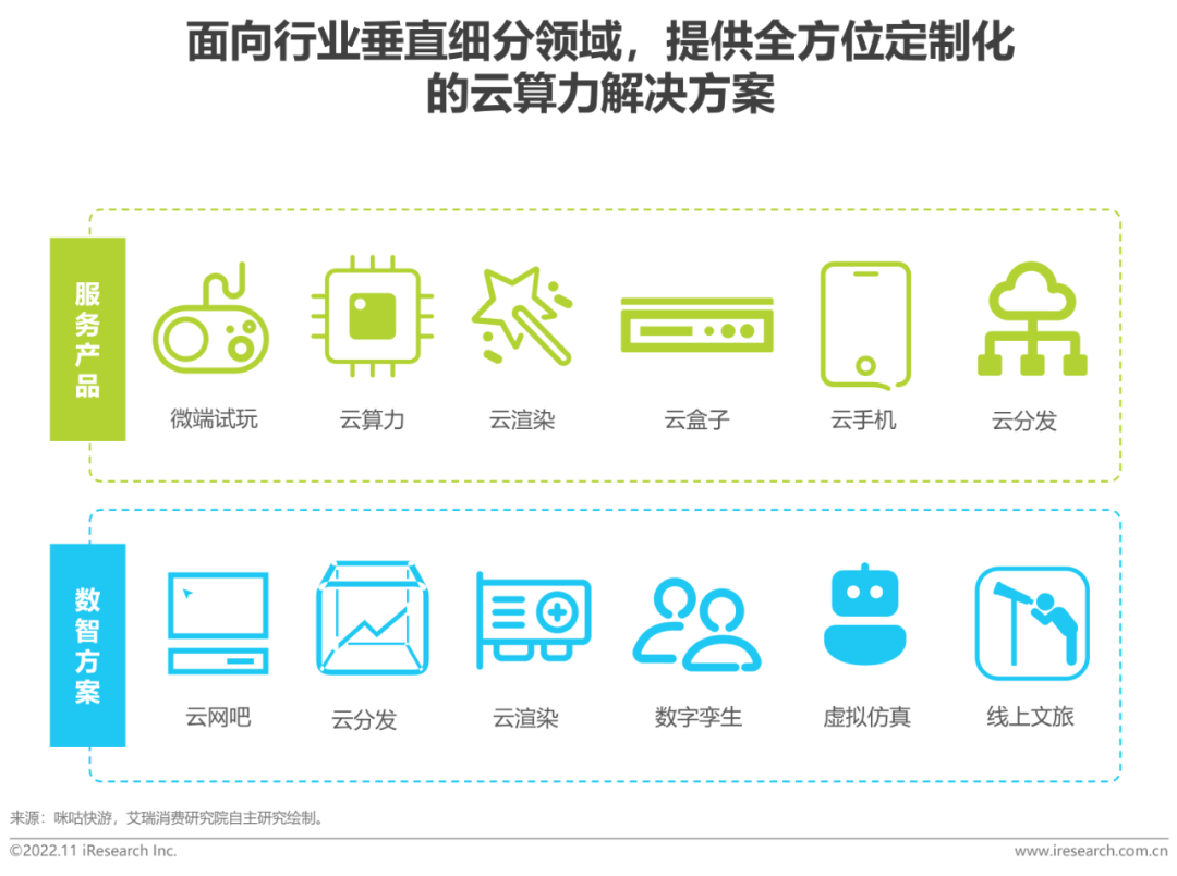 除了面向游戏玩家的云游戏平台,咪咕基于云游戏服务平台的算力底座,融合中国移动云网能力,通过软硬件系统构建,提供面向政企客户的服务产品,如算力服务、云渲染、云终端(盒子)、云终端(手机)等。针对B端客户个性化的算力需求场景,依托咪咕云端算力资源池及网络资源,提供定制化的端到端数智算力解决方案,如云网吧、车载屏游戏场景、云试玩推广、数字孪生、虚拟仿真、线上文旅等。