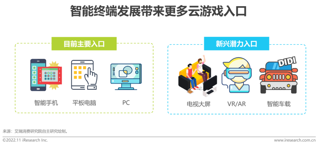 PC、智能手机和平板电脑是传统游戏的主要接入渠道,也是目前云游戏的主要入口。随着智能终端的快速发展,云游戏的便捷性和低配置要求,使得更多的终端如智能电视、VR/AR和车载设备等均可成为云游戏的场景入口。其中云游戏大屏端有着巨大的成长潜力,以电视大屏为核心的家庭共同空间有望被云游戏所激活,打造未来的家庭娱乐中心。