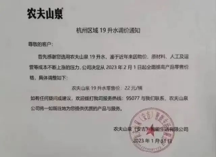 近日,一张农夫山泉《杭州区域19升水调价通知》在业内流传。《通知》显示,农夫山泉计划提高杭州市19L规格桶装水的售价,由此前的20元/桶提高至22元/桶,涨幅达10%。农夫山泉的客服证实了这一消息的真实性。