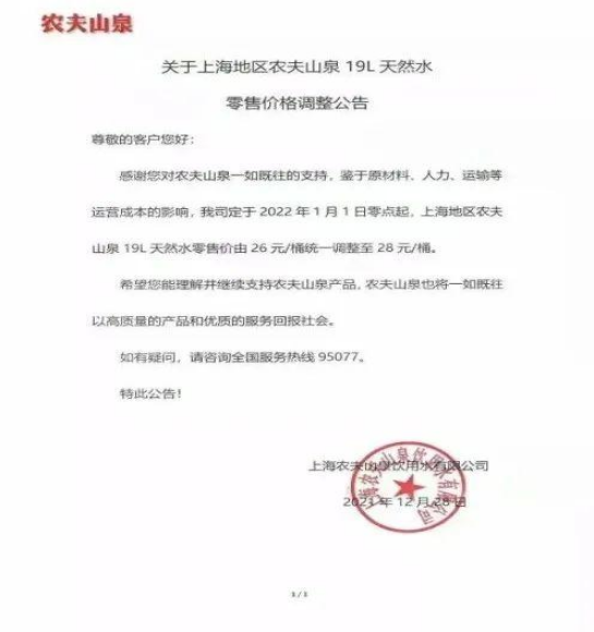 事实上,这并不是农夫山泉第一次涨价。早在2021年12月28日,农夫山泉就曾就上海地区19L天然水零售价格进行调整,从26元/桶上涨为28元/桶。