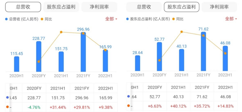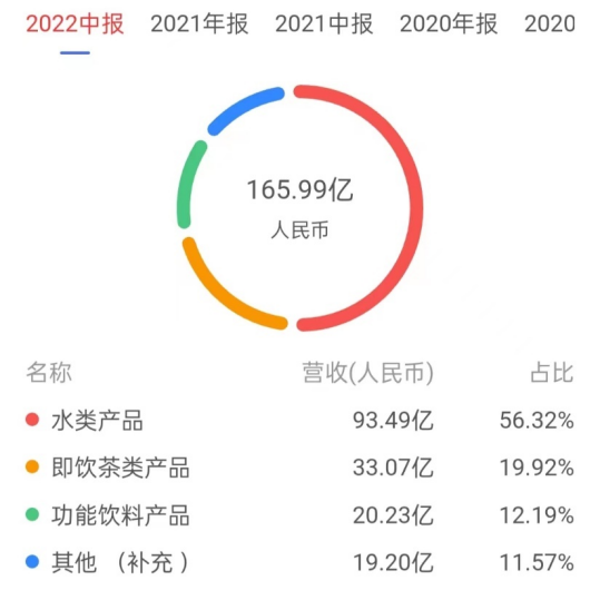 农夫山泉2022年上半年的业绩增速也大幅放缓。数据显示,2022年上半年,农夫山泉实现总收入约165.99亿元,同比增长9.4%;股东应占溢利46.08亿元,同比增长14.8%。较2021年上半年大幅下降。