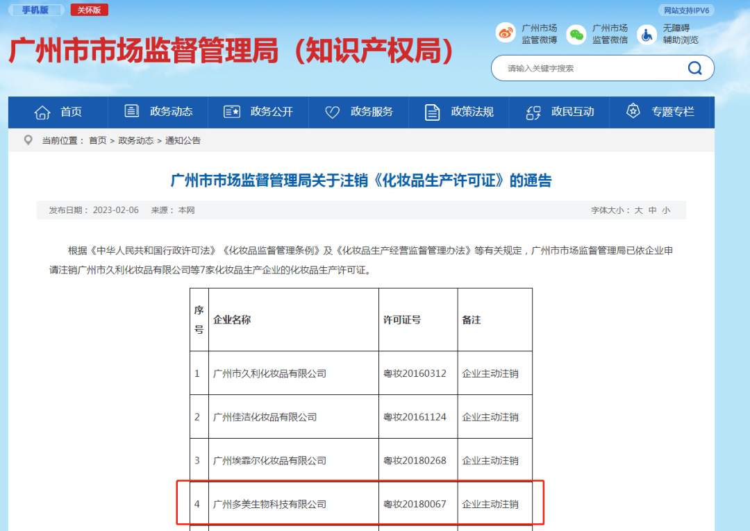 根据广州市市场监督管理局发布的通告,多美生物系主动注销化妆品生产许可证,其许可证号为“粤妆20180067”。