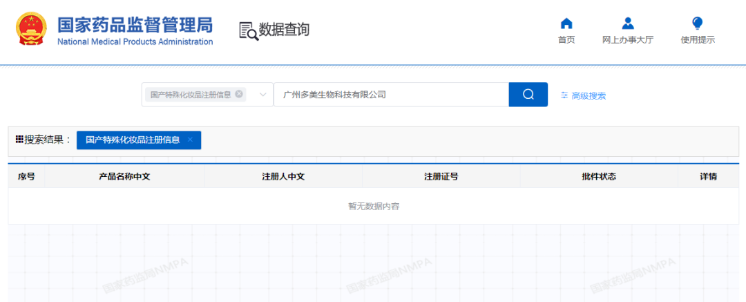今日,青眼在国家药监局官网检索发现,截至2023年2月7日,多美生物并无国产特殊化妆品的注册信息。