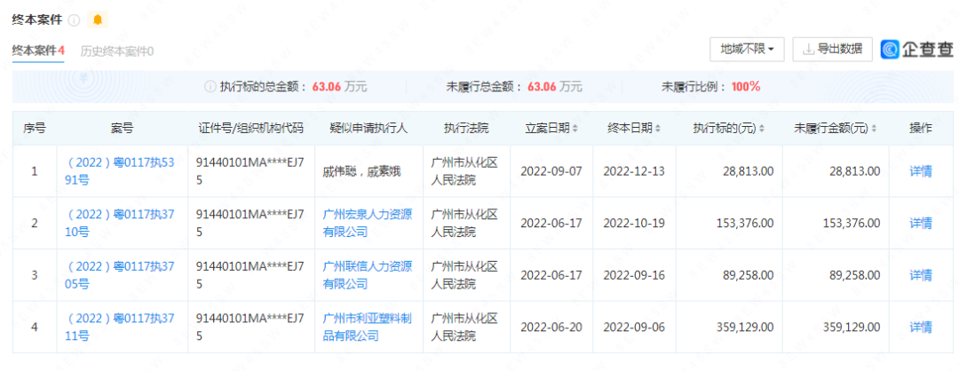 随后,广州市从化区人民法院又对上述4起执行案件做出了终本处理。据青眼了解,终本案件一般是指“对确无财产可供执行的案件,法院将暂时终结执行程序并做结案处理,待发现财产后继续恢复执行”。