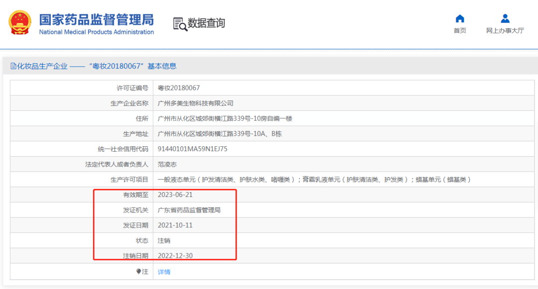 根据上述信息,青眼在国家药监局官网检索发现,多美生物化妆品生产许可证发证日期是2021年10月11日,有效期则是2023年6月21日。但在2022年12月30日,多美生物化妆品生产许可证已显示注销,距离有效期仍有半年之久。